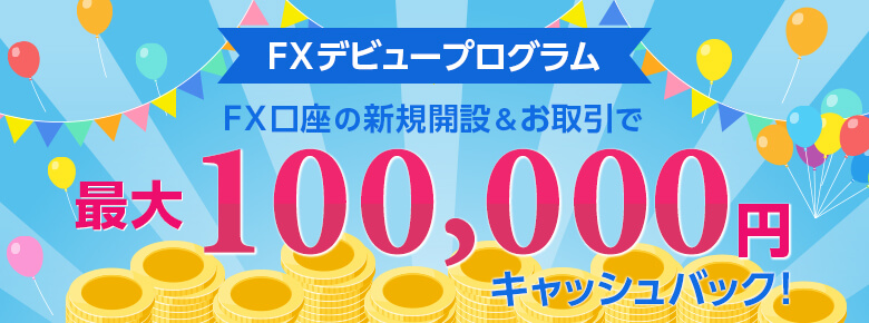 FX口座を新規に開設し、エントリーすると、新規取引の合計数量に応じて最大10万円のキャッシュバックが受けられるプログラムです。