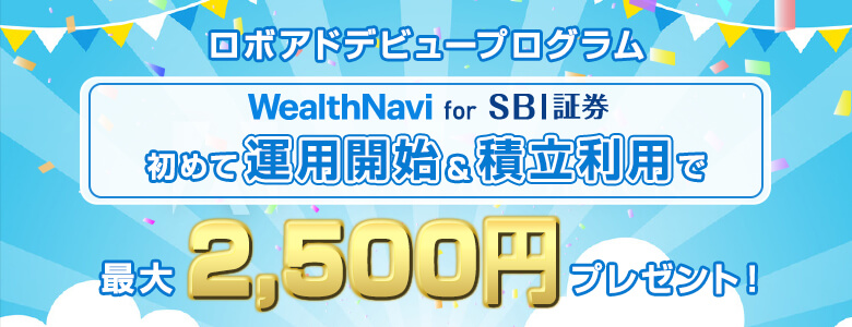 WealthNavi for SBI証券の口座に10万円以上を入金し、自動積立で1万円以上の引き落としを行うことで、最大で2,500円がもらえるプログラムです。