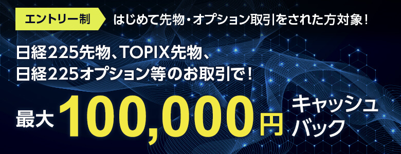 先物・オプション口座を新規に開設し、エントリーすると、取引合計数量に応じて最大10万円のキャッシュバックが受けられるプログラムです。