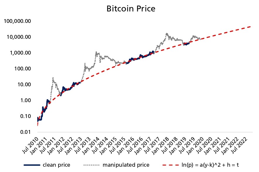 そしてそのメトカーフの法則に当てはめた際のビットコインの予想価格が以下の通りです。